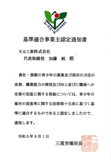 行われ、ユースエール認定企業として認定して頂きました。