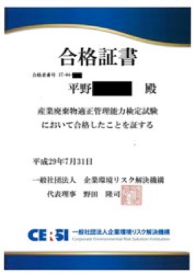 以前参加させて頂いた産業廃棄物管理担当者育成セミナーに引き続き、7/6に産業廃棄物適正管理能力検定を受験させて頂き、両2名とも合格しました。
